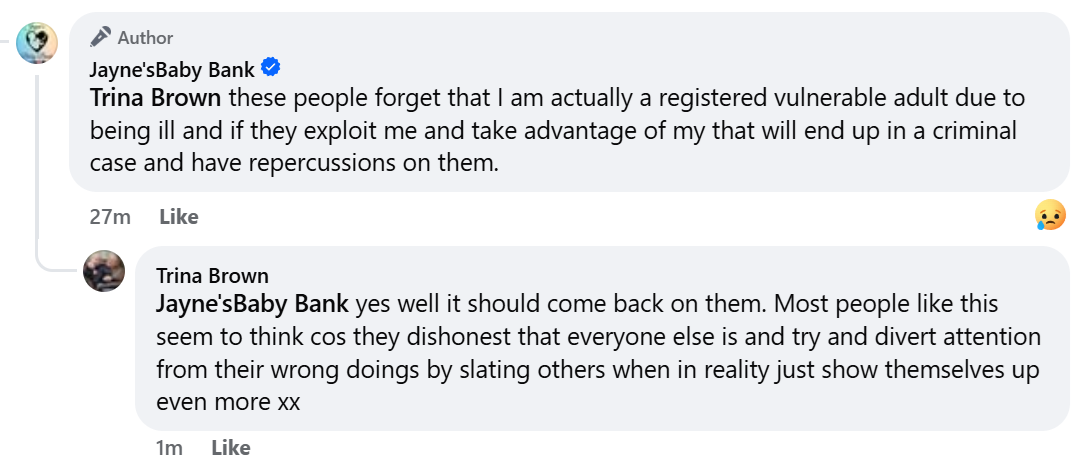 Jayne’s BabyBank has issued a reply regarding the article, including images that show messages exchanged between Nicola and “Jayne”. It is worth noting that Nicola clearly withdrew consent (telling Jayne to stop multiple times). She identified risk early on (referencing Charity Commission involvement and saying she did not want to “go to jail”). In frustration, Nicola also used abusive language; what is not shown is that during this period Jayne was launching social media abuse against Cwtch-Up for going against her.