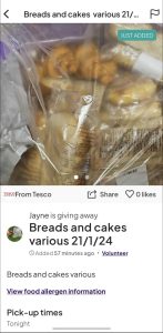 “Check the Olio listing attached for ‘Breads and cakes’ – you can see the same image used on her Facebook page claiming it’s a collection that they ‘can’t give out to the public yet.’ You’ll notice the Olio listing is in her name, not the volunteer she claims collected it.”