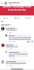 “Attaching the Olio evidence, all yours to compile against what is/was readily available on her Facebook profile. It shows her taking Olio food collections, diverting the food and claiming on Facebook to be from Fareshare, even when she was asked multiple times was it Olio food – she always deleted those comments very quickly.”