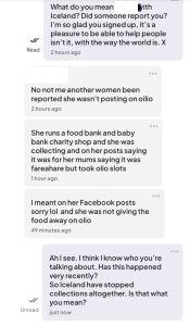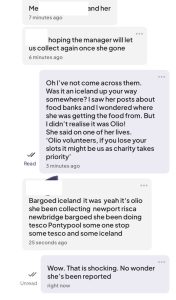 “It also shows her trying to recruit volunteers to collect the Olio food on her behalf even though the collection slots were claimed by ‘Jayne’ and that food should’ve been listed on Olio – she would merely list one listing on Olio not to trigger a warning. Trying to get unsuspecting volunteers to collect food they legitimately thought was charity/fareshare while it was meant for Olio, makes them unwitting accomplices.”