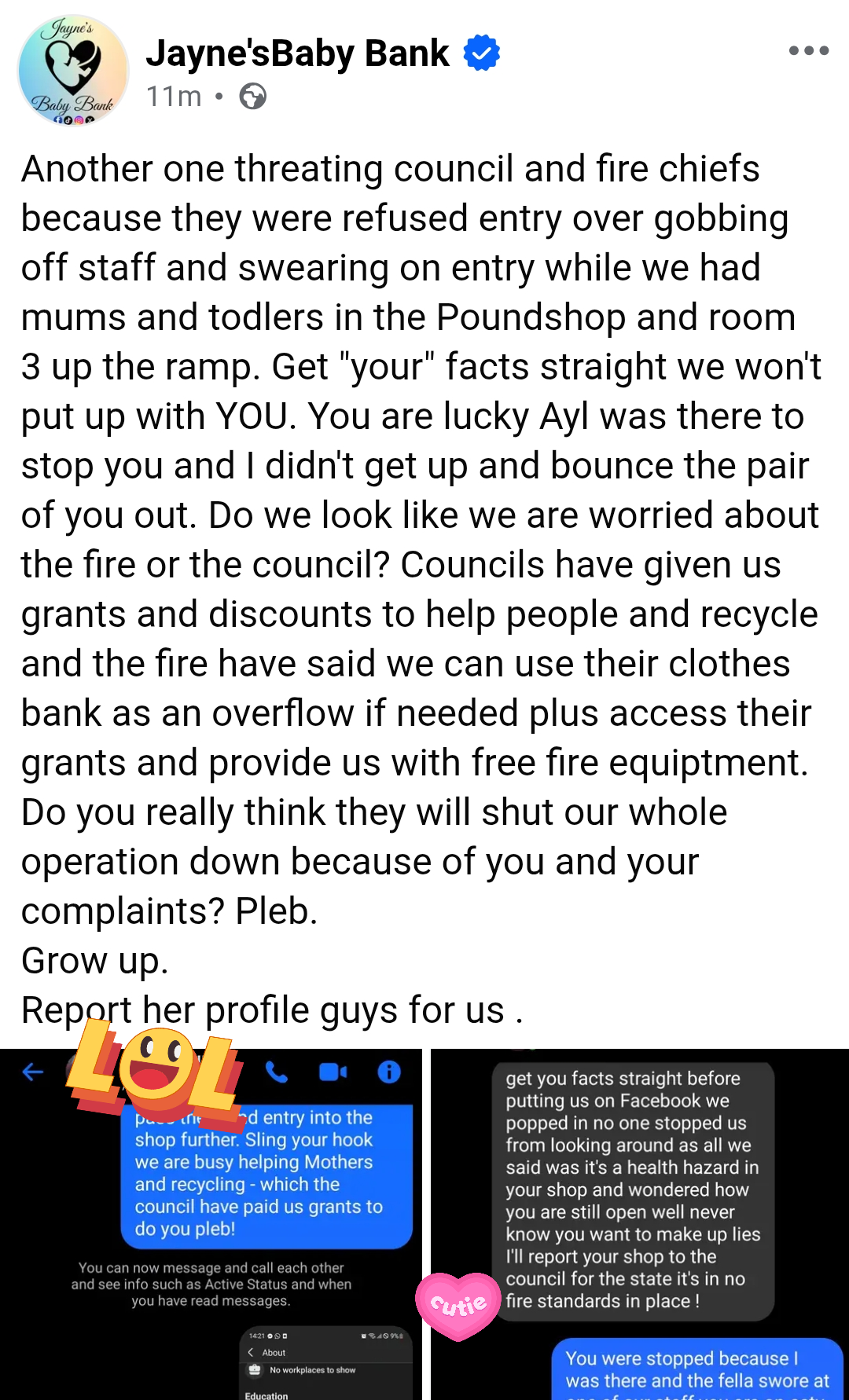 This comment relates to material published on the secondary Facebook account titled “J’armarnis B Outique” (stated publicly as connected with Jayne’s Baby Bank).