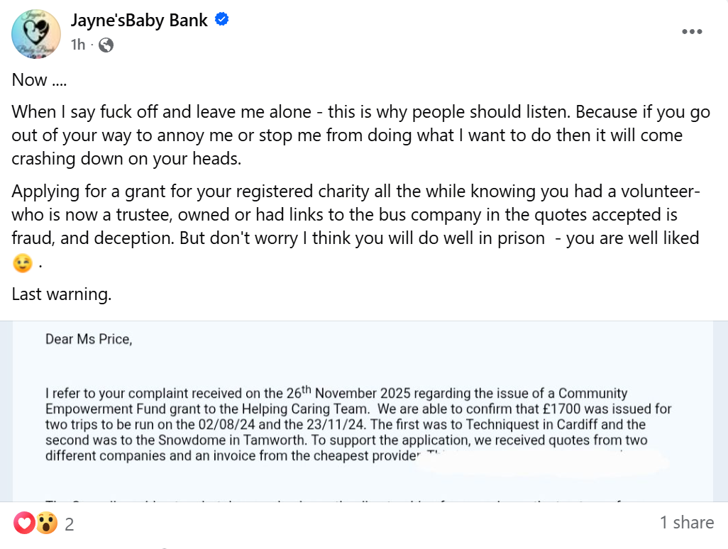 “I made the heartbreaking decision to step down from the trustee board solely to protect the charity. Sadly, the harassment continued. I have since involved the police and sought legal support. One individual is now on bail awaiting trial. The other has escalated further. I cannot say more at this time, as I fully intend to see justice through — but I will say this: I will never tolerate abuse, not towards me, my family, or our charity.”