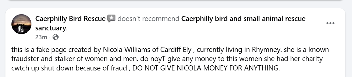 “PLEASE BE AWARE THIS WOMAN IS NOTHING TO DO WITH CAERPHILLY BIRD RESCUE.”