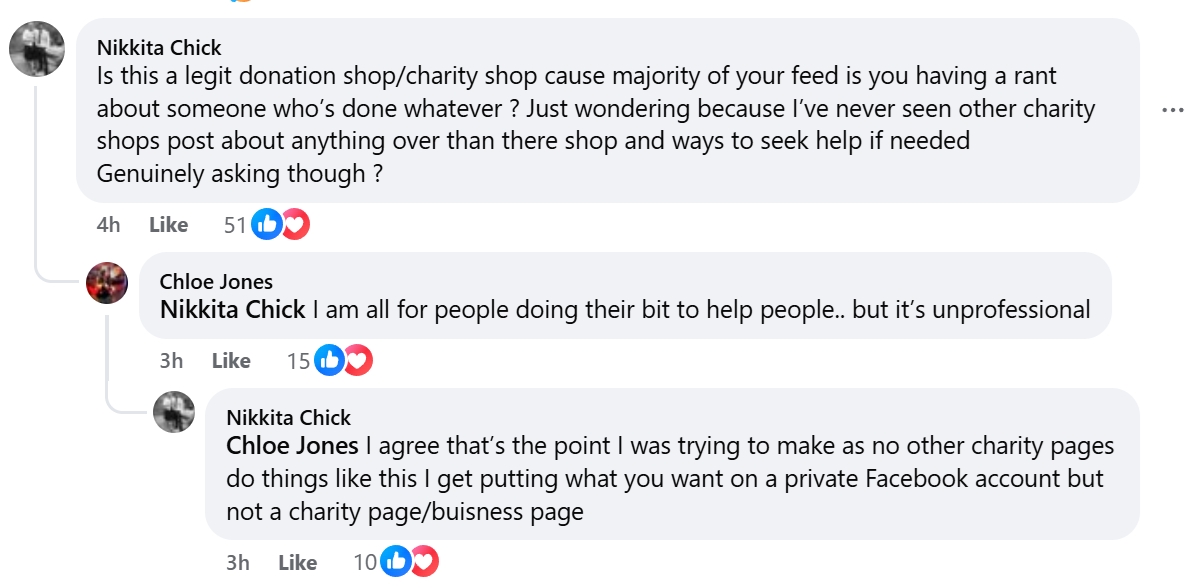 When neutral users publicly ask whether this is a legitimate charity shop, and point out that no other charity pages behave like this, that is not trolling. That is reputational damage caused by your own content strategy.