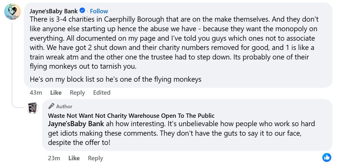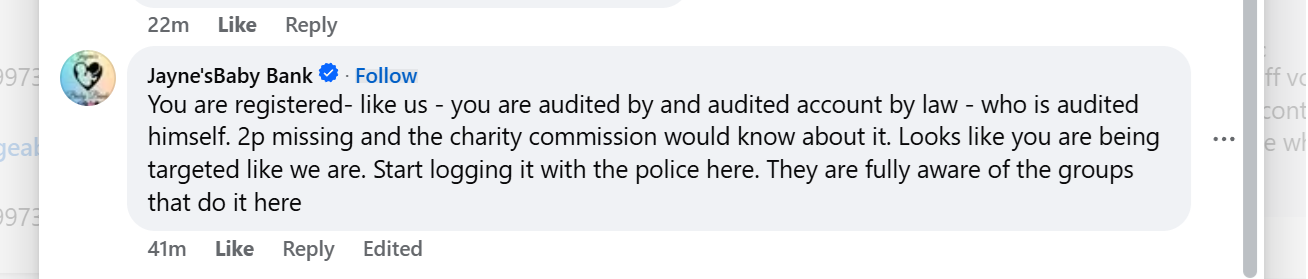 Final clarification: under no circumstances have we accused Jayne’s Baby Bank of laundering money. What we do document is the repeated historical and ongoing representation, including in selective private group posts, of being a “charity” or “charity shop”. It is important to note that a CIC is not a charity.