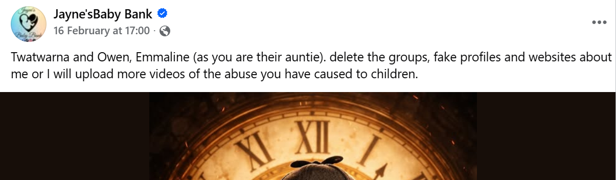 Subsequently, Carrie-Anne Ridsdale, also known as Jayne Price, created a separate Facebook group titled “Jayne’s Baby Bank STALKERS & HATERS Exposed”. The group appears to focus on discrediting critics, revisiting prior grievances and targeting individuals associated with the original Exposed group. Of particular concern are instances where references have extended to members’ families. Any involvement of children in online disputes raises serious safeguarding questions. In one such post she threatened to release videos of what she claimed as “child abuse”.