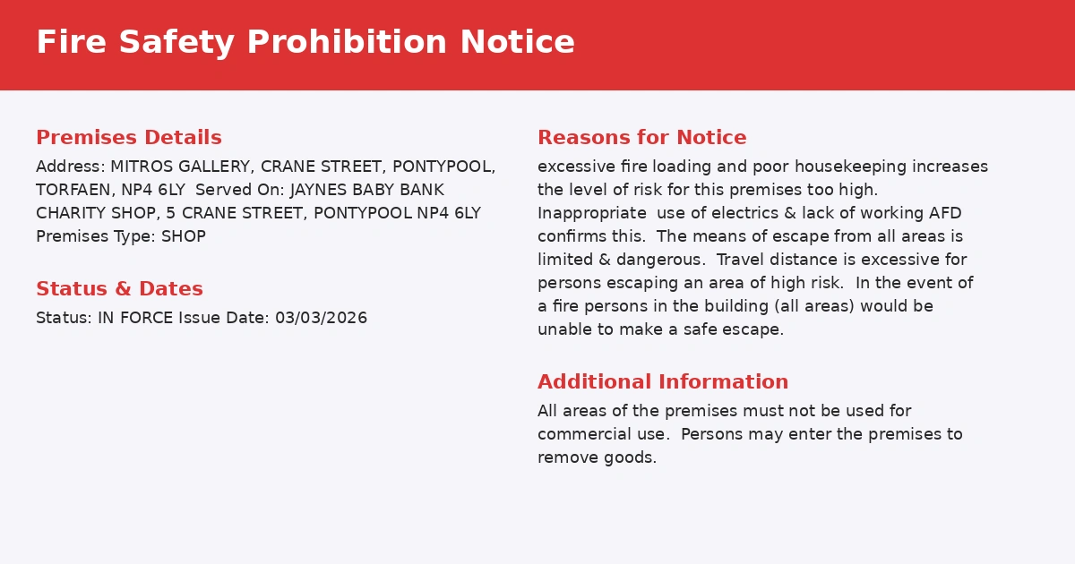 A review of the National Fire Chiefs Council (NFCC) Enforcement Register confirms that a Prohibition Notice is currently in force at: Jaynes Baby Bank Charity Shop, 5 Crane Street, Pontypool (NP4 6LY).