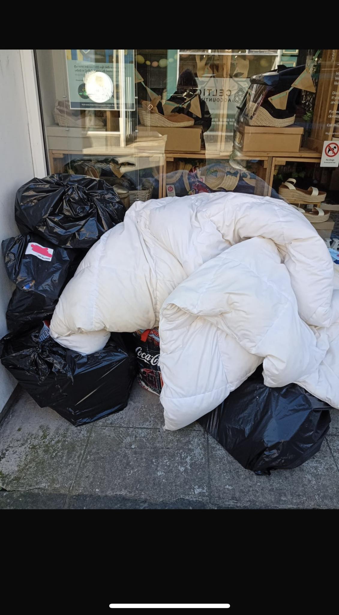 The material observed includes multiple black refuse sacks, donation bags, and bulky household items such as duvets and mixed goods. The volume and consistency of the dumping indicate a repeated pattern rather than isolated incidents. This has resulted in obstruction of the shop frontage and has required regular clearance.