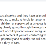 - Unverified partnerships and authority: Posts claim links with local councils, police, and social services, including authority to make referrals and support in court. Council correspondence in the materials states no endorsement and no permission to refer on its behalf.