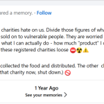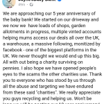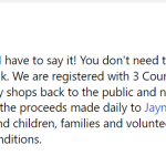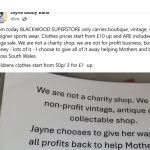 - Questionable fundraising conduct: Shops and car-boot style stalls are promoted as “fundraising” while selling donated goods. Some posts advertise “free” items subject to a “minimum donation”, which is not free in practice.